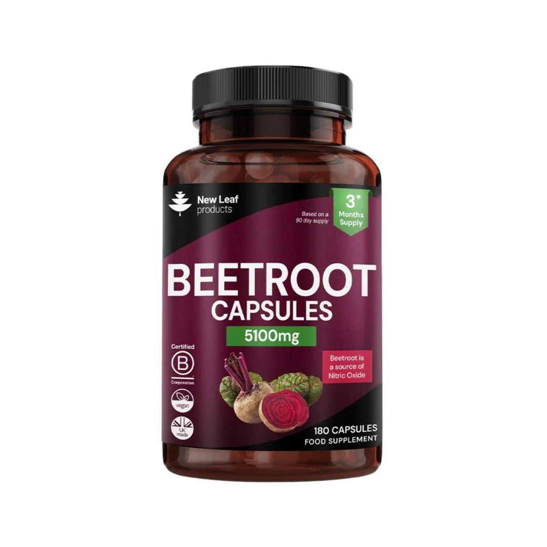 New Leaf’s Beetroot Capsules deliver 5100mg per serving, combining Beetroot Extract and Beetroot Powder for a potent and balanced formulation. Naturally rich in vitamins and minerals such as vitamin C, iron, potassium, and folate, beetroot is a nutrient-dense vegetable valued for its role in traditional and modern diets. Enhanced with black pepper for improved absorption, this supplement provides a convenient three-month supply with 180 capsules.