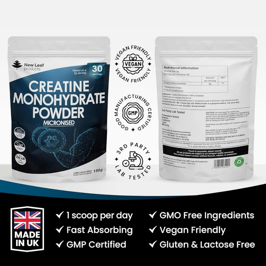 This high-strength, highly absorbent formula can significantly enhance the capacity for short, intense bursts of energy, pushing the fatigue threshold further for more powerful, prolonged workouts. It helps to accelerate muscle growth and strength gains while supporting muscle recovery. It can also improve mental alertness, making it an essential supplement for athletes aiming for peak physical and cognitive performance. Elevate your performance and recovery with New Leaf's vegan-friendly creatine powder made according to GMP standards with ingredients free from GMOs, gluten, artificial colours and flavours.