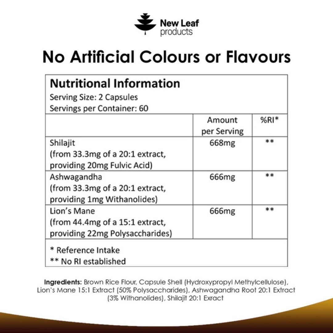 Support energy, focus, and vitality with New Leaf Shilajit Complex – a high-strength 2000mg formula with Ashwagandha, Lion’s Mane, and 60% fulvic acid.